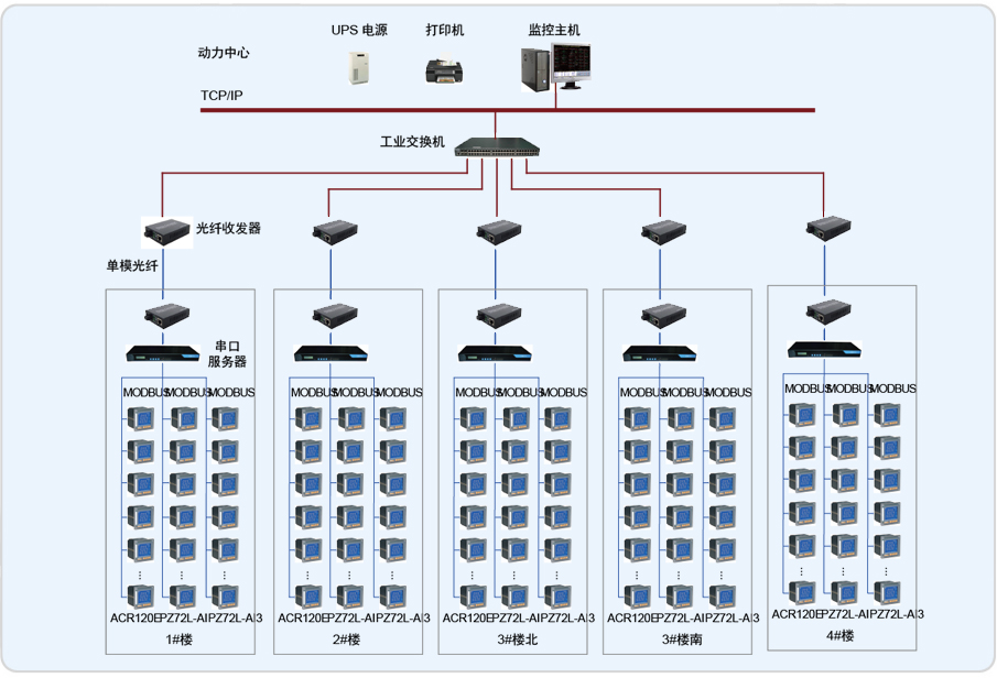 系统采用Acrel-2000型电力监控系统,整个系统采用网络分布式结构,监控主机位于2#楼前面地下一层的动力中心中,其他5个配电室分别位于1#、2#、3#、4#地下一层(其中3#有南北两个配电室),所有配电回路均配备安科瑞电力仪表PZ系列及ACR系列。该项目实现了淄博运动员公寓4个楼内电力系统的智能管理。所有监控设备均通过屏蔽双绞线至各自配电室内的通讯管理机,再通过光电转换器经过光纤将数据传输至2#楼地下一层的动力中心,从而实现远程监控。