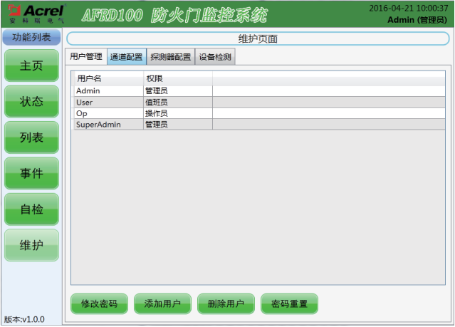 该界面设有三种操作级别,操作权限级别依次为“超级管理员”→“管理员”→“操作员”,其中高级别可添加低级别的新用户。