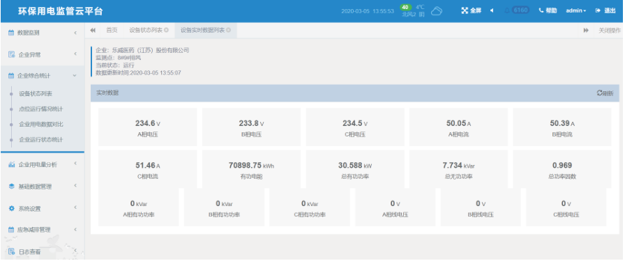 设备状态分析:统计分企业某个时间段内的产污设备运行、停机,监测设备失联,可以查看实时上报的数值。