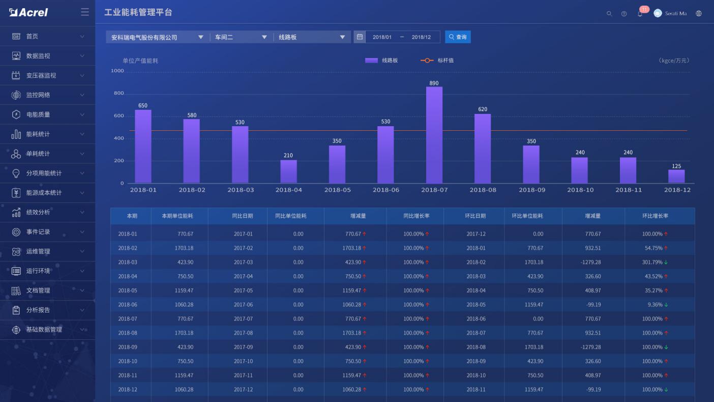与企业MES系统对接,通过产品产量以及系统采集的能耗数据,在产品单耗中生成产品单耗趋势图,并进行同比和环比分析。同时将产品单耗与行业/国家/国际先进指标对标,以便企业能够根据产品单耗情况来调整生产工艺,从而降低能耗。