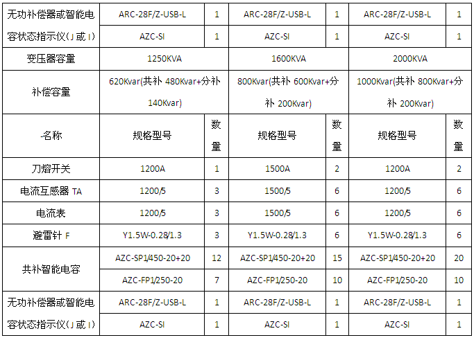 1、变压器容量为400/800/1000/1250/1600/2000KVA的三相补偿应用方案。