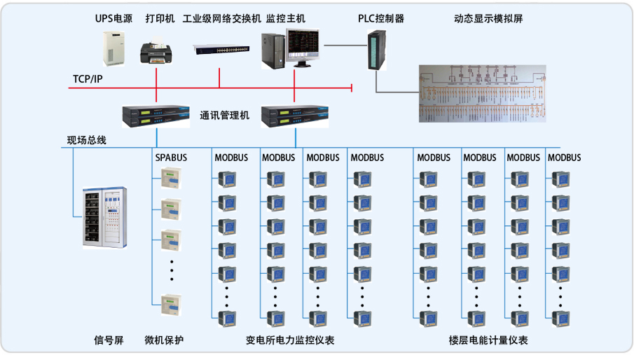 整个系统采用网络分布式结构,监控主机位于地下一层变电所值班室内,各变电所配电柜内安装有本公司ACR330ELH、ACR220EFLK仪表共计200多回 路,第三方设备共计200多台。系统采用开放的通讯协议,通过现场总线与高低压配电系统、变压器温控装置、直流屏、模拟屏实现数据通讯功能。同时监视系统提供标准的RS485接口向上连接到BMS系统。