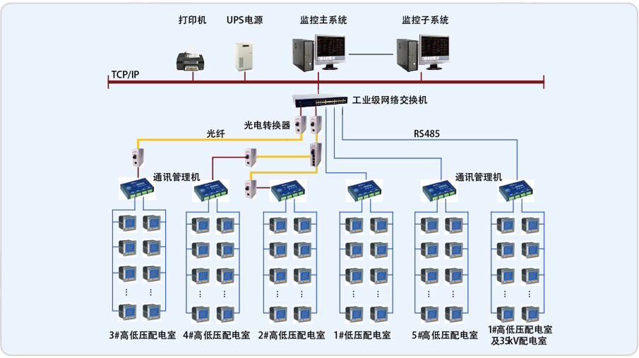 浦江双辉大厦监控部分有1个35kV配电室, 1#、2#、3#、4#、5#5个配电室分10kV高压和0.4kV低压。35kV配电室有高压电力仪表、综保和2台变压器温控仪,另外5个配电室有10kV高压电力仪表和综保,0.4kV低压部分有电力仪表和22台变压器温控仪。35kV和1#配电室分布在A栋的B2层,2#配电室分布在B栋的B2层,3#配电室分布在A栋的33楼,4#配电室分布在B栋的33楼,5#配电室分布在A栋的B4层。针对浦江双辉大厦的实际情况,通过计算机和通讯网络,将分散的配电所的现场设备连接为一个有机的整体,实现电网设备运行的远程监控和集中管理。
