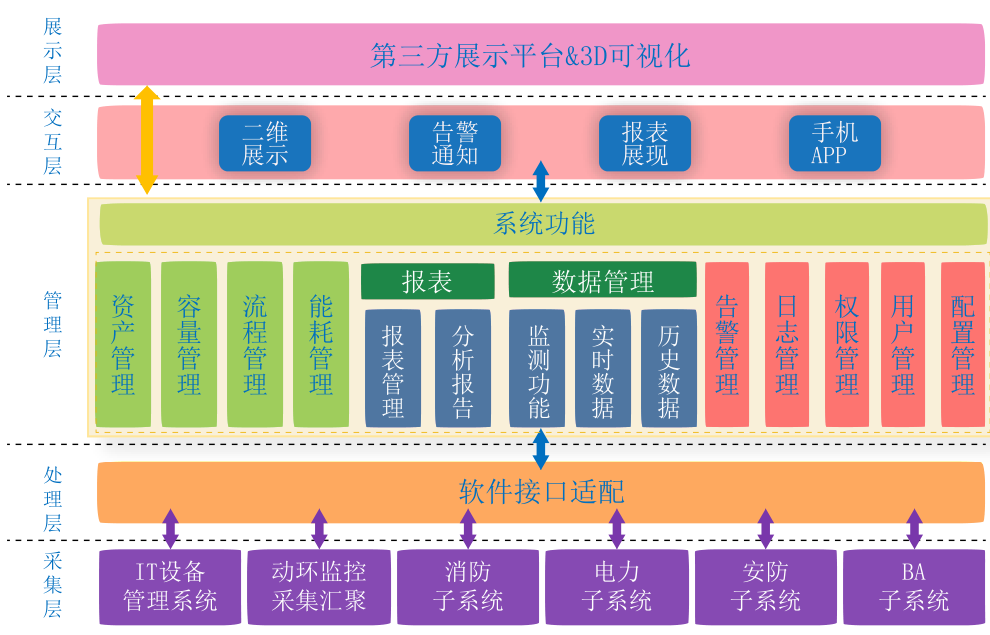整个系统管理架构分为采集层、处理层、管理层、交互展示层四个层次。